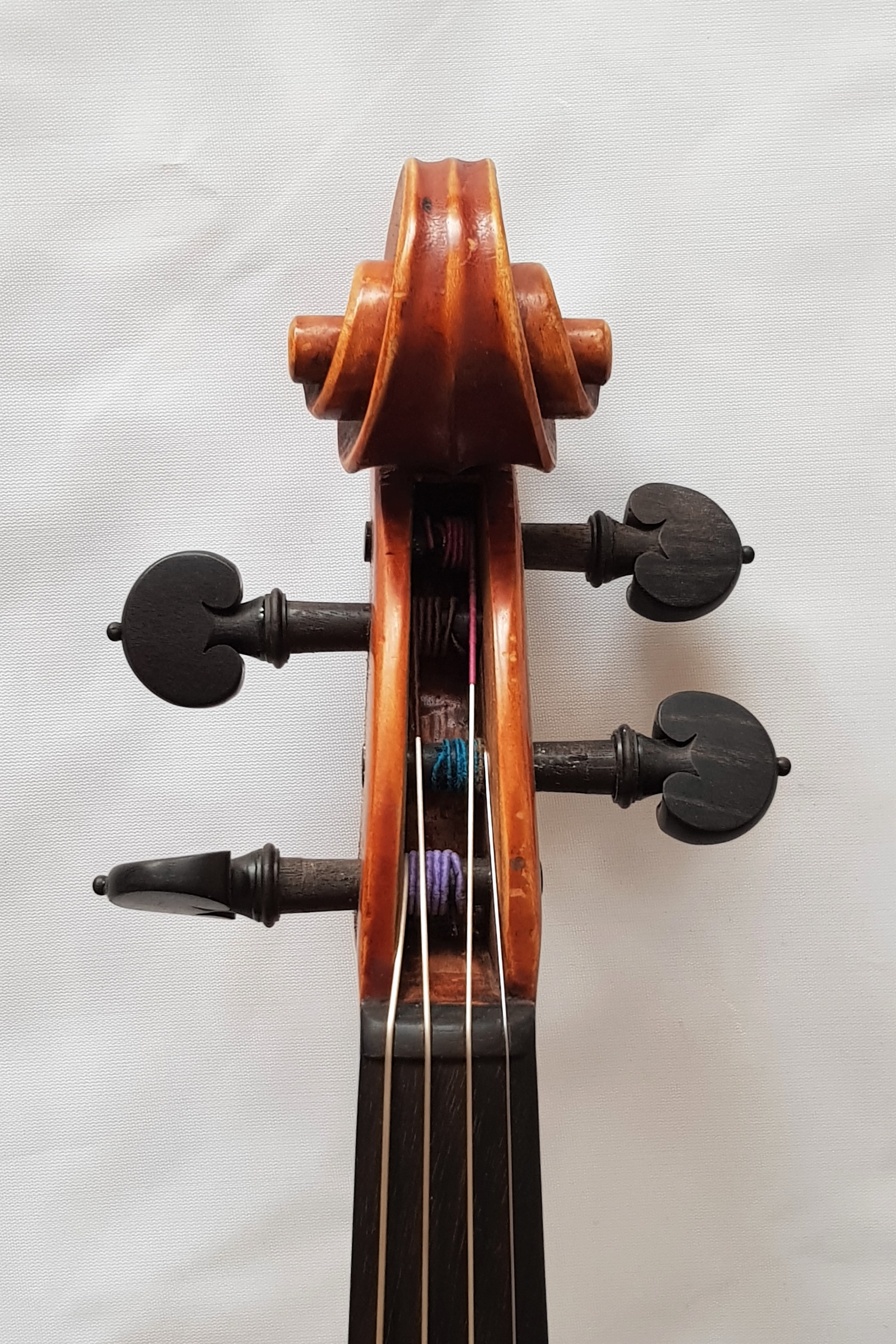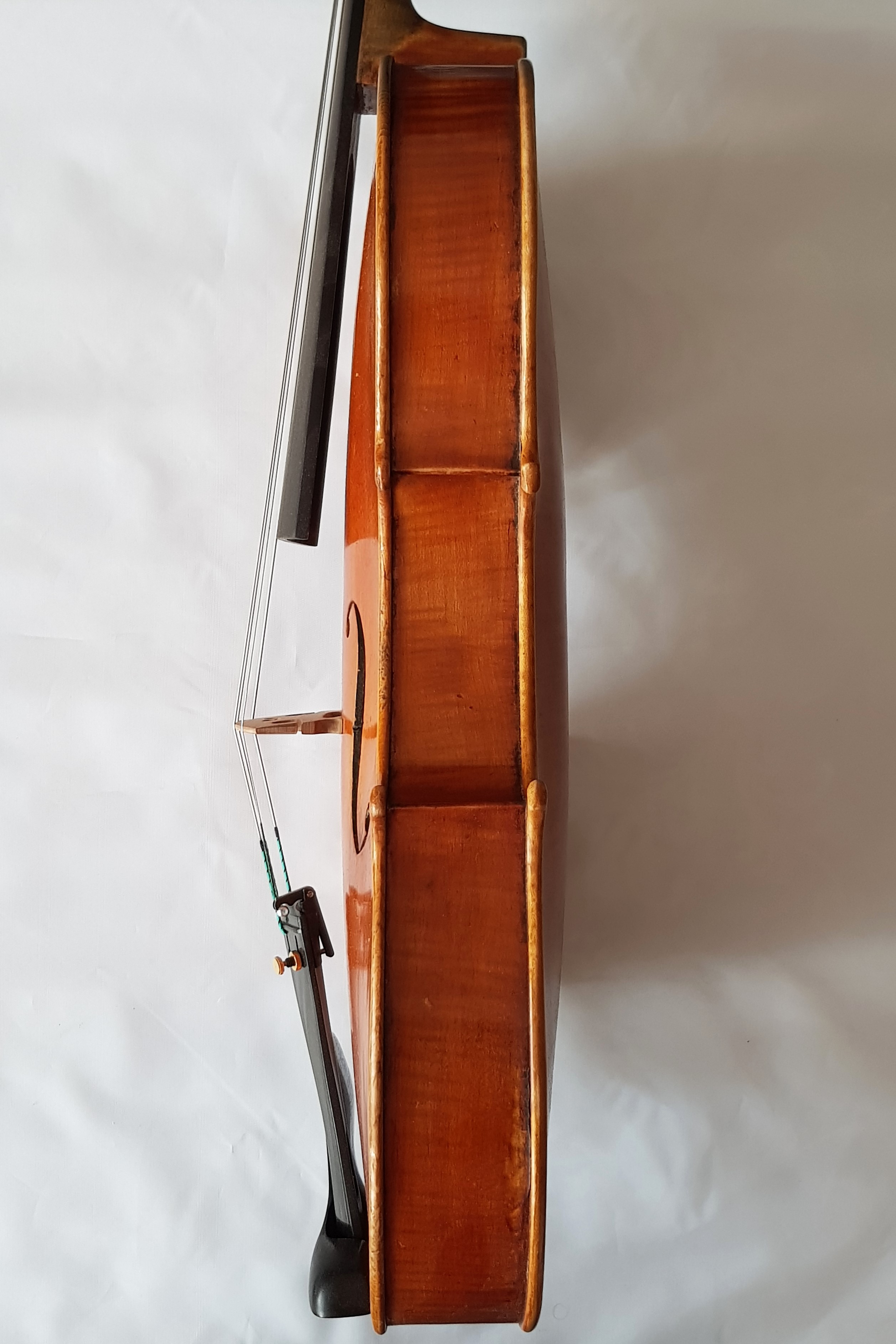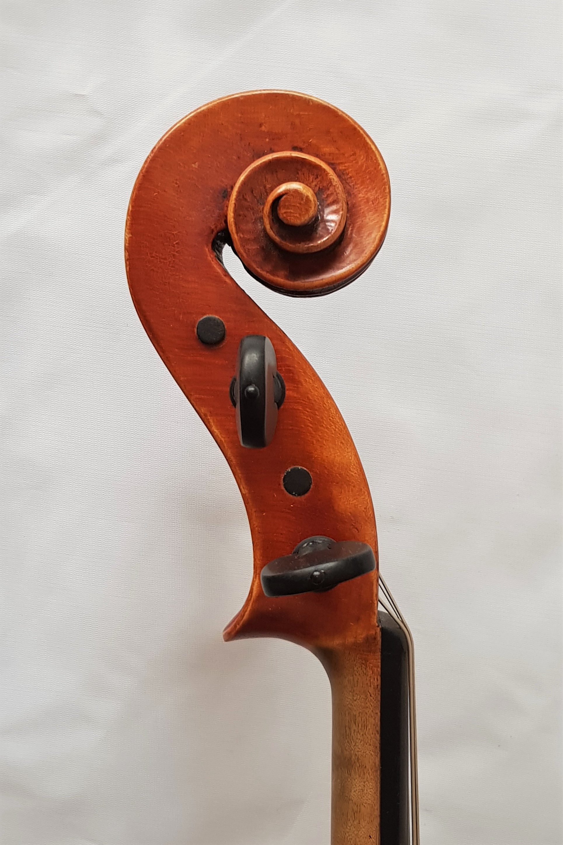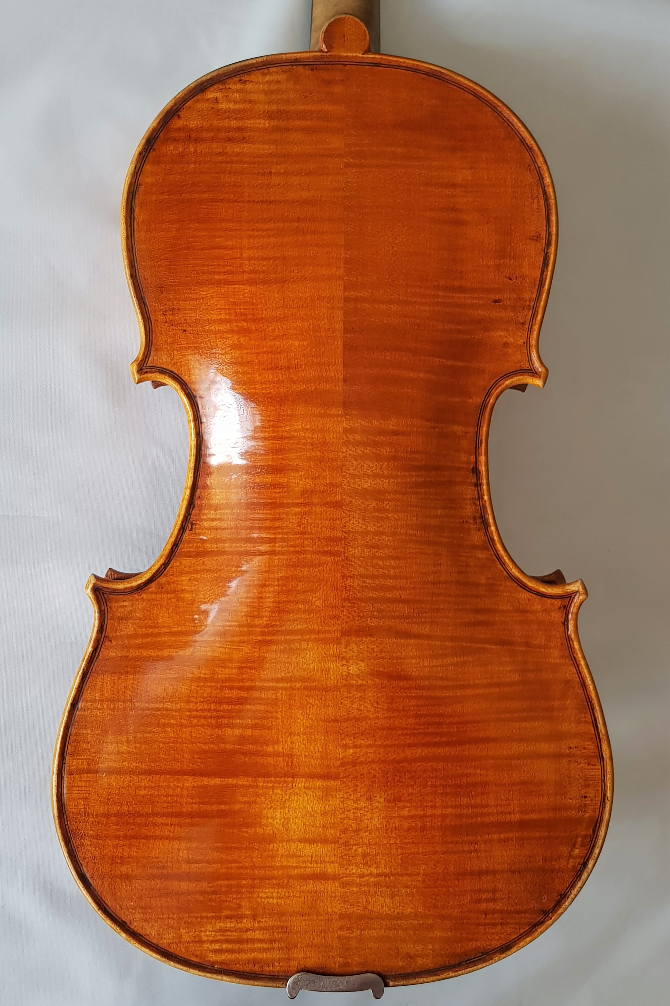 Geprägt von einem rotbraunen Lack auf einem goldgelben Grund, strahlt die Viola Giovanni Colonna eine besondere Eleganz aus. Die Details reichen vom filigran gearbeiteten Saitenhalter und den gut abgestimmten Wirbeln, bis hin zum sorgfältig gestalteten Endknopf.